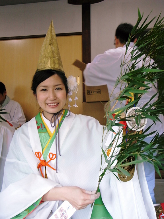 古い福笹を返してからお参りして新しい福笹をいただき、福娘に吉兆をつけてもらいます。